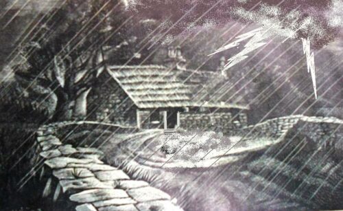 Quando cuidava do fogo, bateram à porta. Ela foi abrir, e entrou um menino, um vizinho próximo. A mulher tirou-lhe o casaco e o boné encharcados e, quando ele se aproximou do fogo, vimos que tinha uns doze anos de idade… e era aleijado. Logo que recuperou o fôlego, o menino disse: – “Minha mãe mandou eu vir ver se a senhora está bem, pois aquele raio caiu aqui bem pertinho!” –“Ah! Muito obrigada, eu estou bem, foi só um susto!“