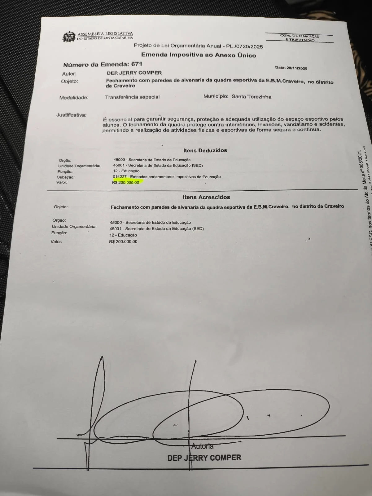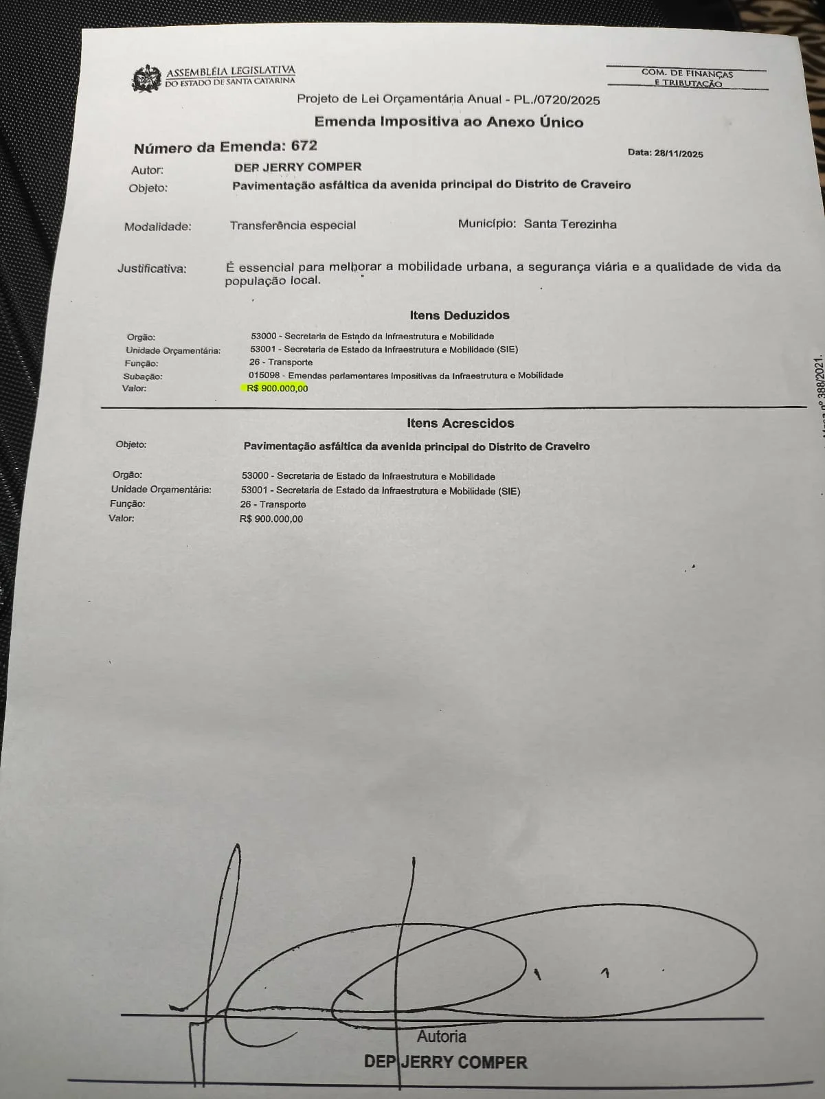 Entre os recursos anunciados está a emenda parlamentar nº 672, no valor de R$ 900 mil, destinada à pavimentação asfáltica da avenida principal do distrito do Craveiro. Na mesma ocasião, também foi viabilizado o empenho nº 671, no valor de R$ 200 mil, que será aplicado na melhoria da quadra esportiva da comunidade, incluindo o levantamento das paredes da estrutura.