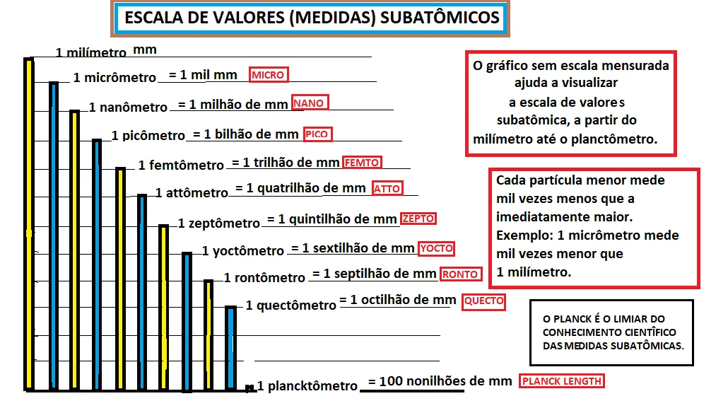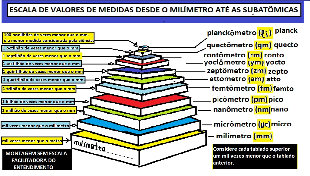 Assim, todas as outras medidas subsequentes, a partir do milímetro, ficam um mil vezes menor que a anterior até chegar na última medida subatômica que a ciência conhece – 0 PLANCK (=100 nonilhões de vezes menor que o milímetro) considerado o fim da escala infinitesimal.